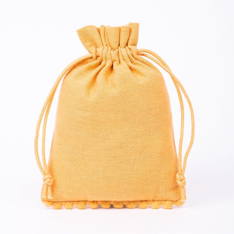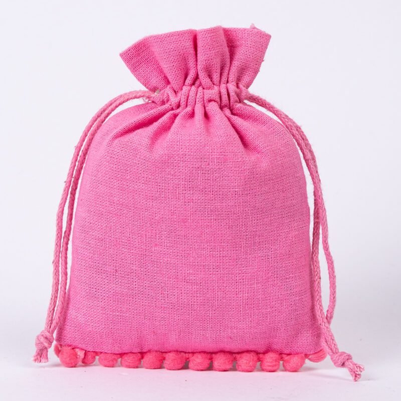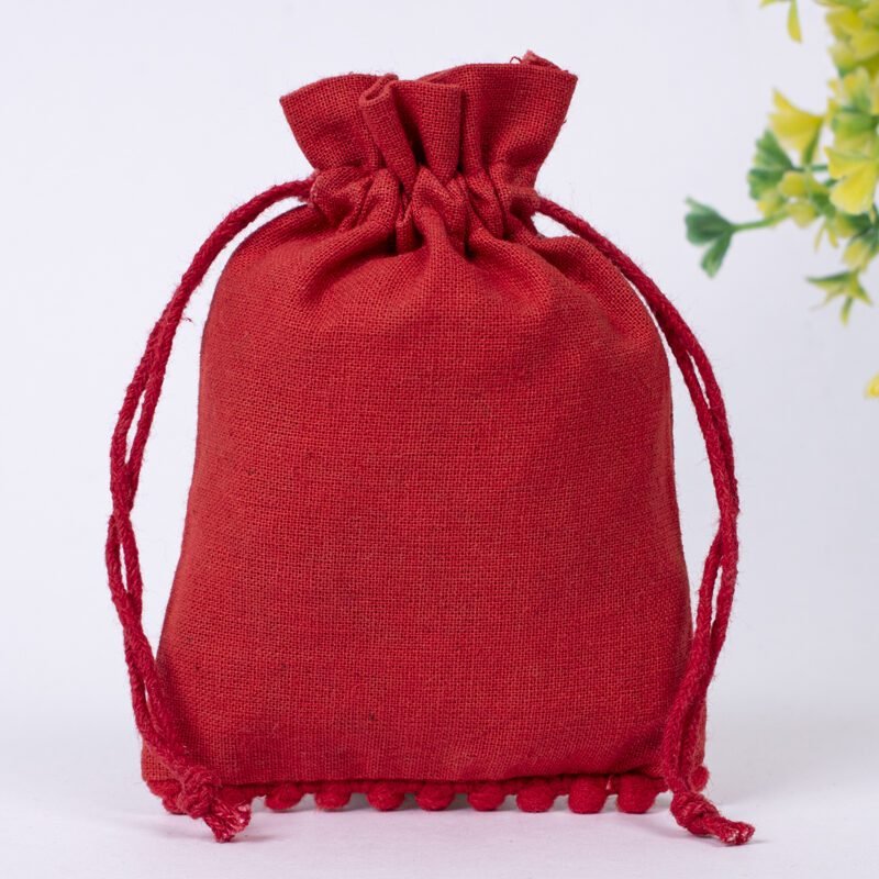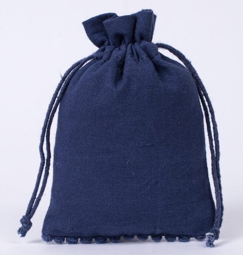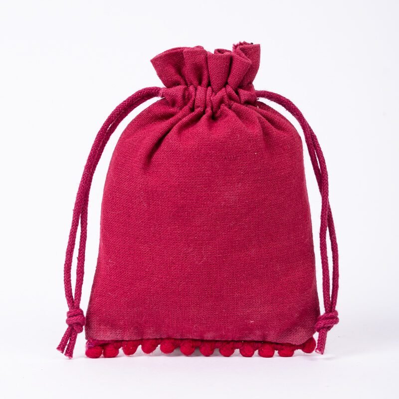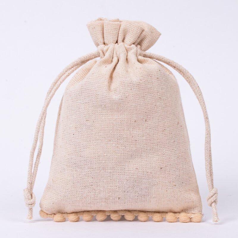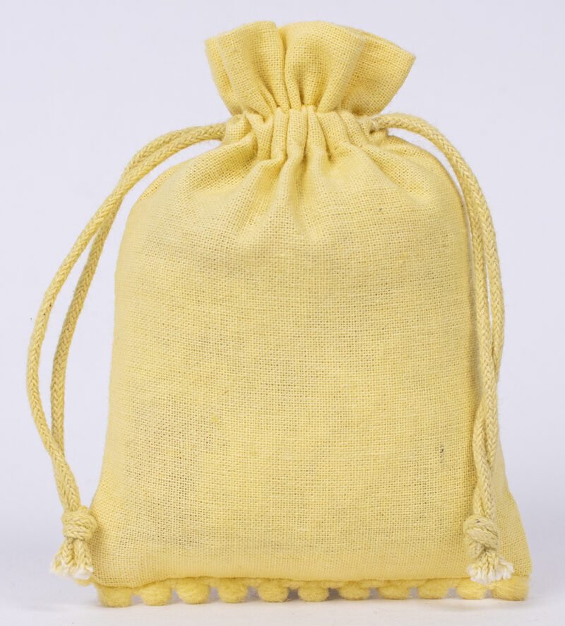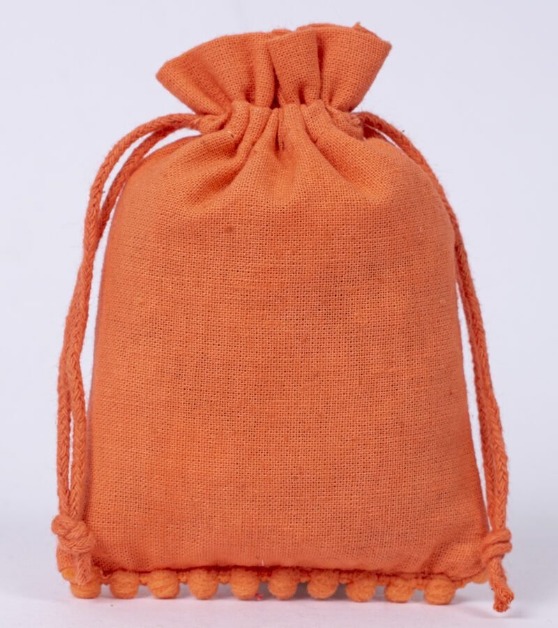 Enhance your packaging with our cotton pouches featuring playful bottom pompoms, crafted in our Indian manufacturing facility. These charming pouches combine practical elegance with whimsical detail, perfect for special occasion packaging.