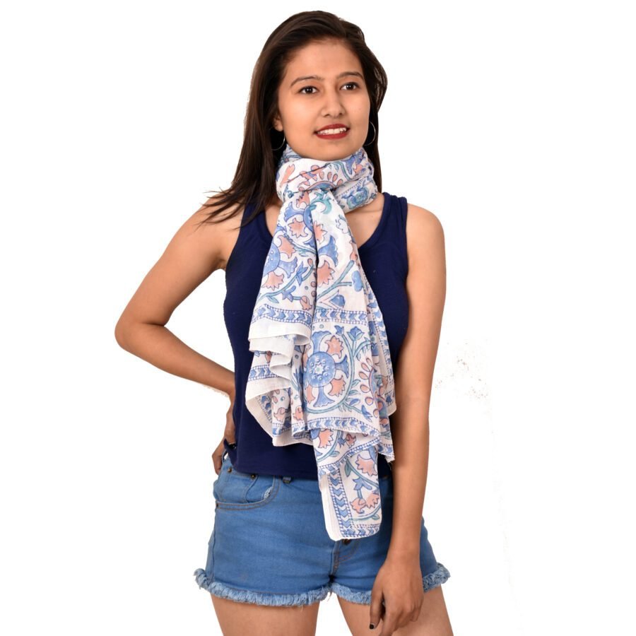 Enhance your collection with this exquisite hand block-printed sarong, adorned with a harmonious blend of vibrant floral motifs in soothing pastel tones of blue, pink, and white. Featuring intricate detailing and a delicately crafted border, this versatile piece highlights the timeless artistry of Indian craftsmanship.