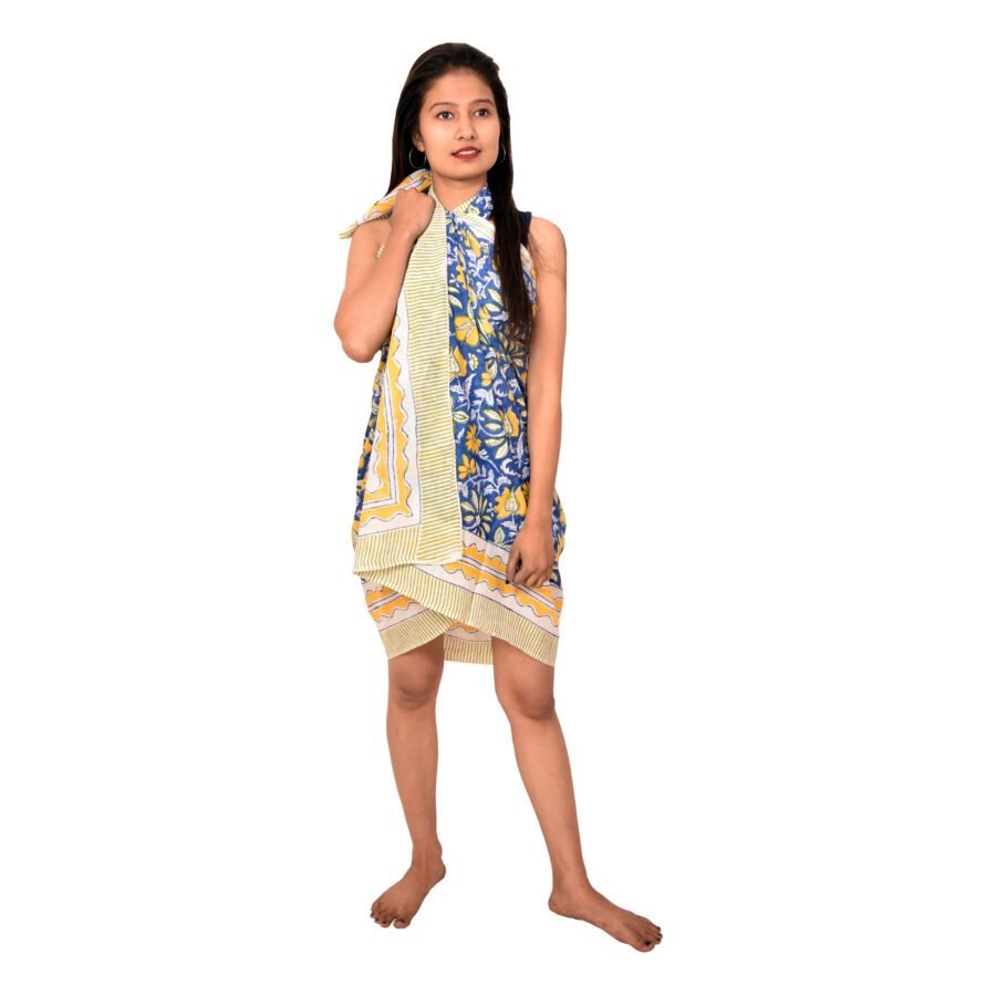 Sunlit Blooms Hand Block Print Sarong | Vibrant Blue & Yellow Resort Wrap & Scarf