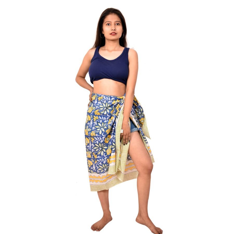 This hand block-printed sarong showcases a lively combination of golden-yellow floral motifs on a rich blue base, enhanced by an elegant border of earthy tones. The bold yet refined design brings warmth and sophistication, making it an excellent choice for boutique displays, beachwear, or resort shops.